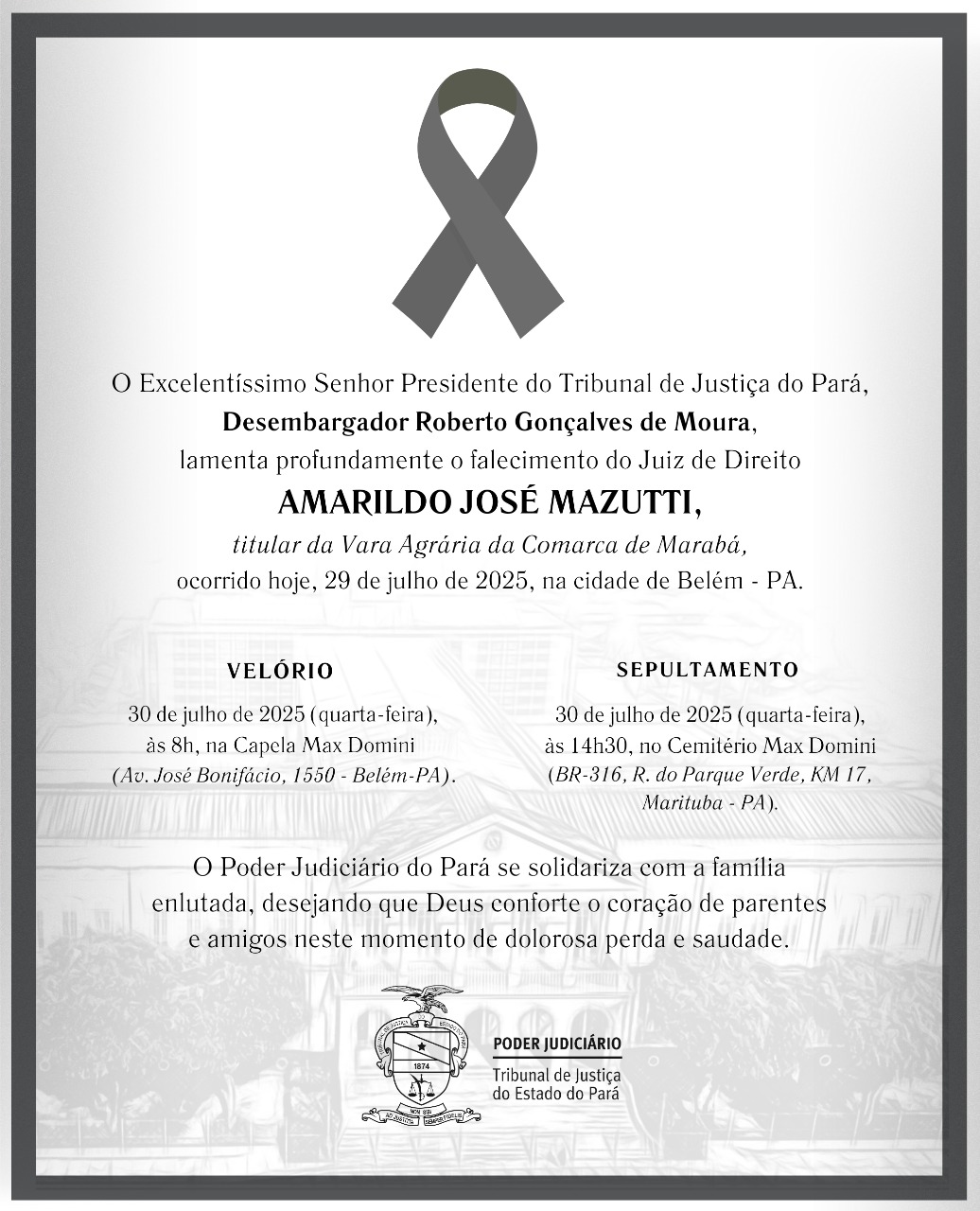 Com pesar, a Presidência do Tribunal de Justiça do Estado do Pará (TJPA) lamenta profundamente o falecimento do juiz Amarildo José Mazutti, titular da Vara Agrária da Comarca de Marabá, ocorrido nesta terça-feira, dia 29 de julho de 2025. O presidente do TJPA, desembargador Roberto Gonçalves de Moura, declarou luto oficial por três dias em todo o Poder Judiciário do Estado do Pará, a contar de 29 de julho, sem prejuízo do expediente ordinário.